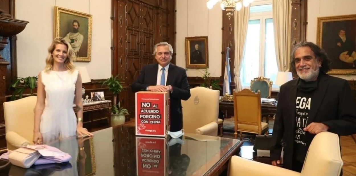Se ve al presidente Alberto Fernández, junto a la actriz Liz Solari y al presidente de la Unión Vegana Argentina, posando con una urna que dice No al acuerdo porcino con China. Se lo ve sonriendo.