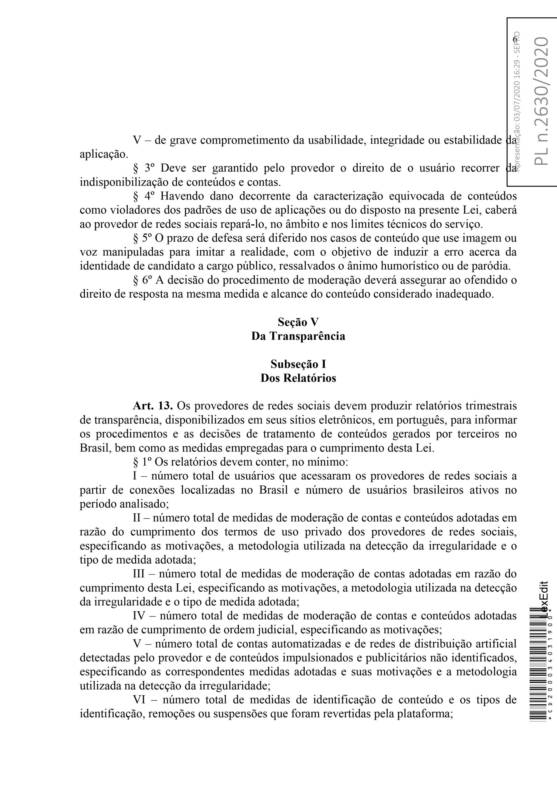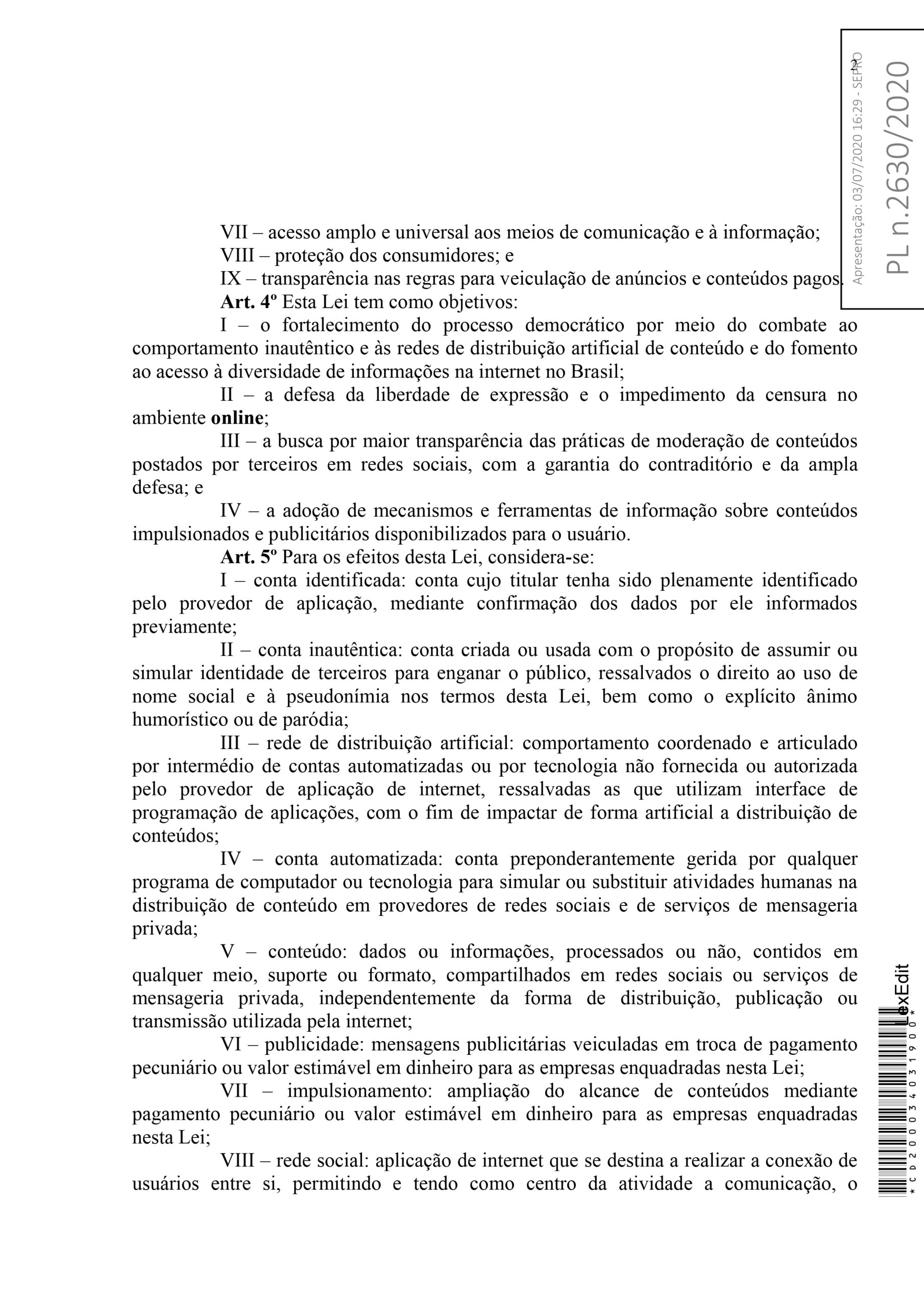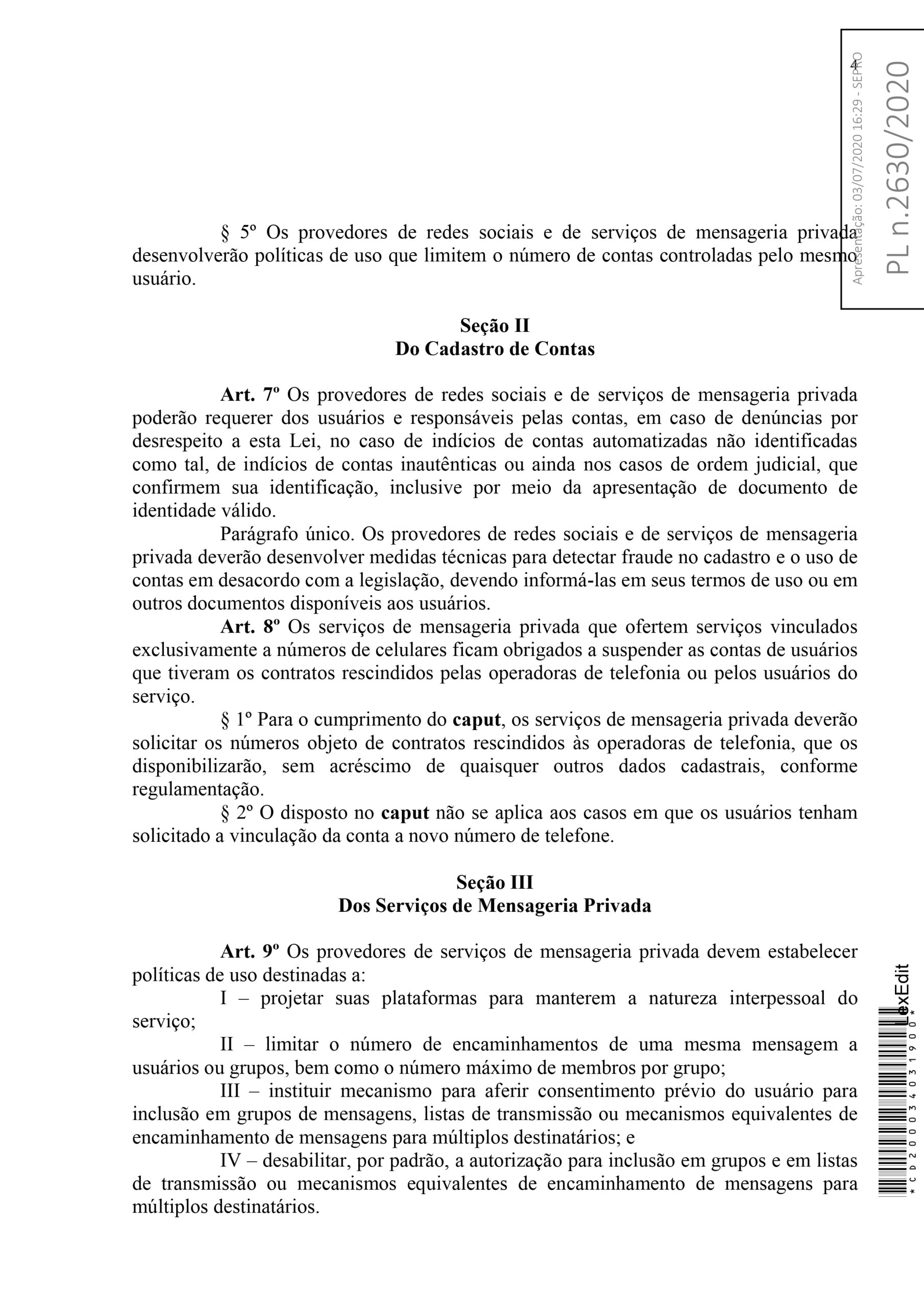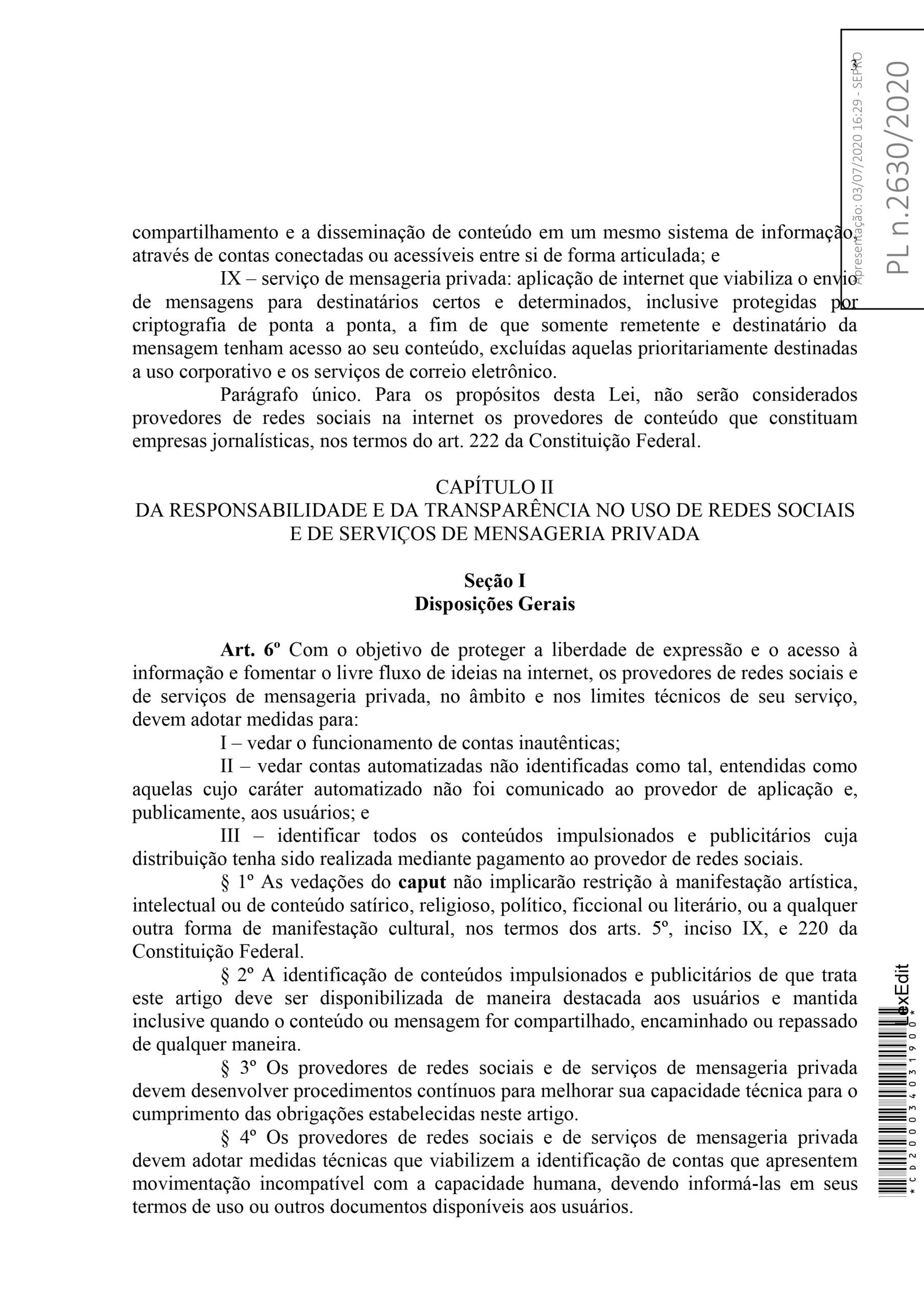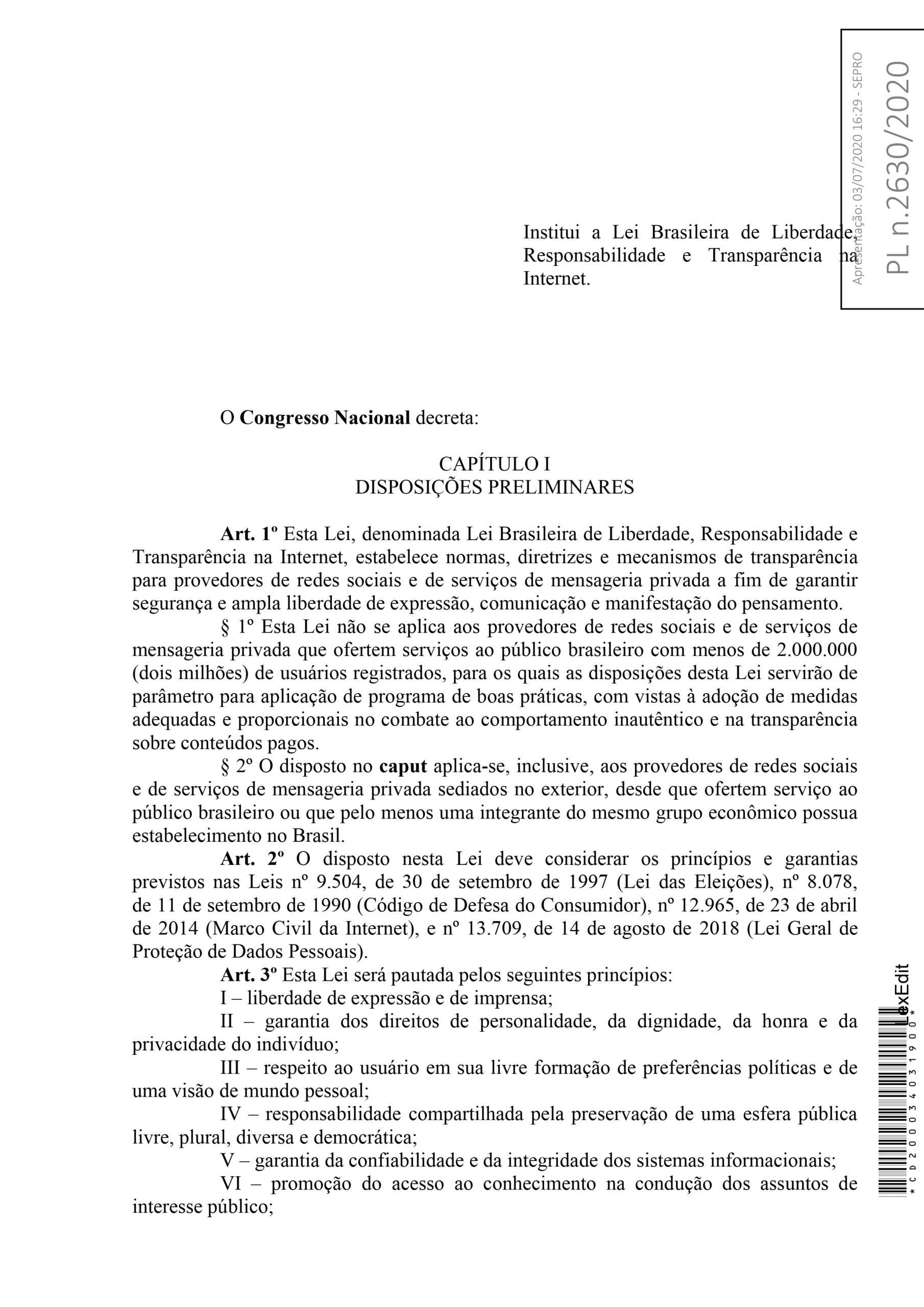 O Projeto de Lei 2630/20 institui a Lei Brasileira de Liberdade, Responsabilidade e Transparência na Internet. O texto cria medidas de combate à disseminação de conteúdo falso nas redes sociais, como Facebook e Twitter, e nos serviços de mensagens privadas, como WhatsApp e Telegram, excluindo-se serviços de uso corporativo e e-mail.