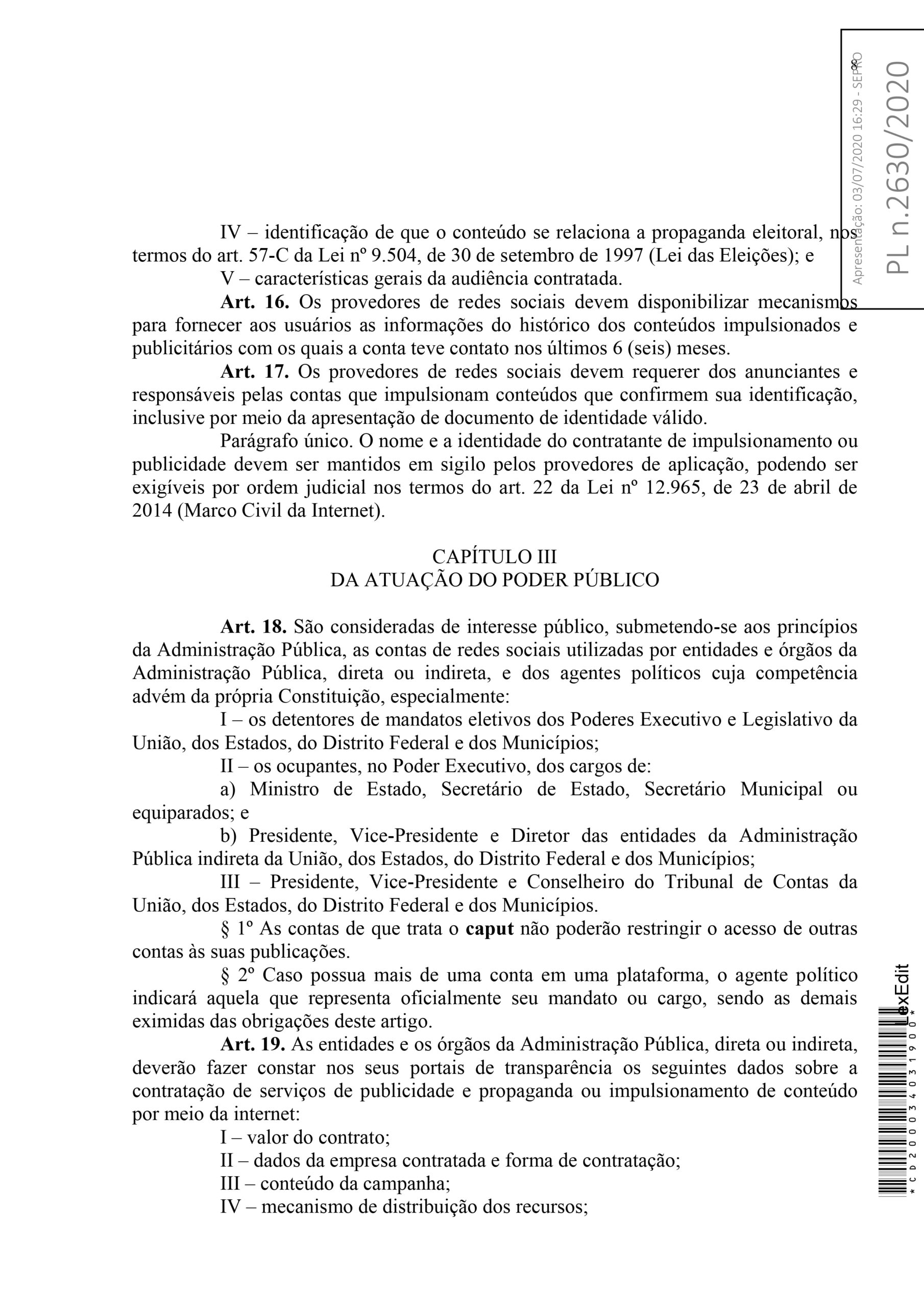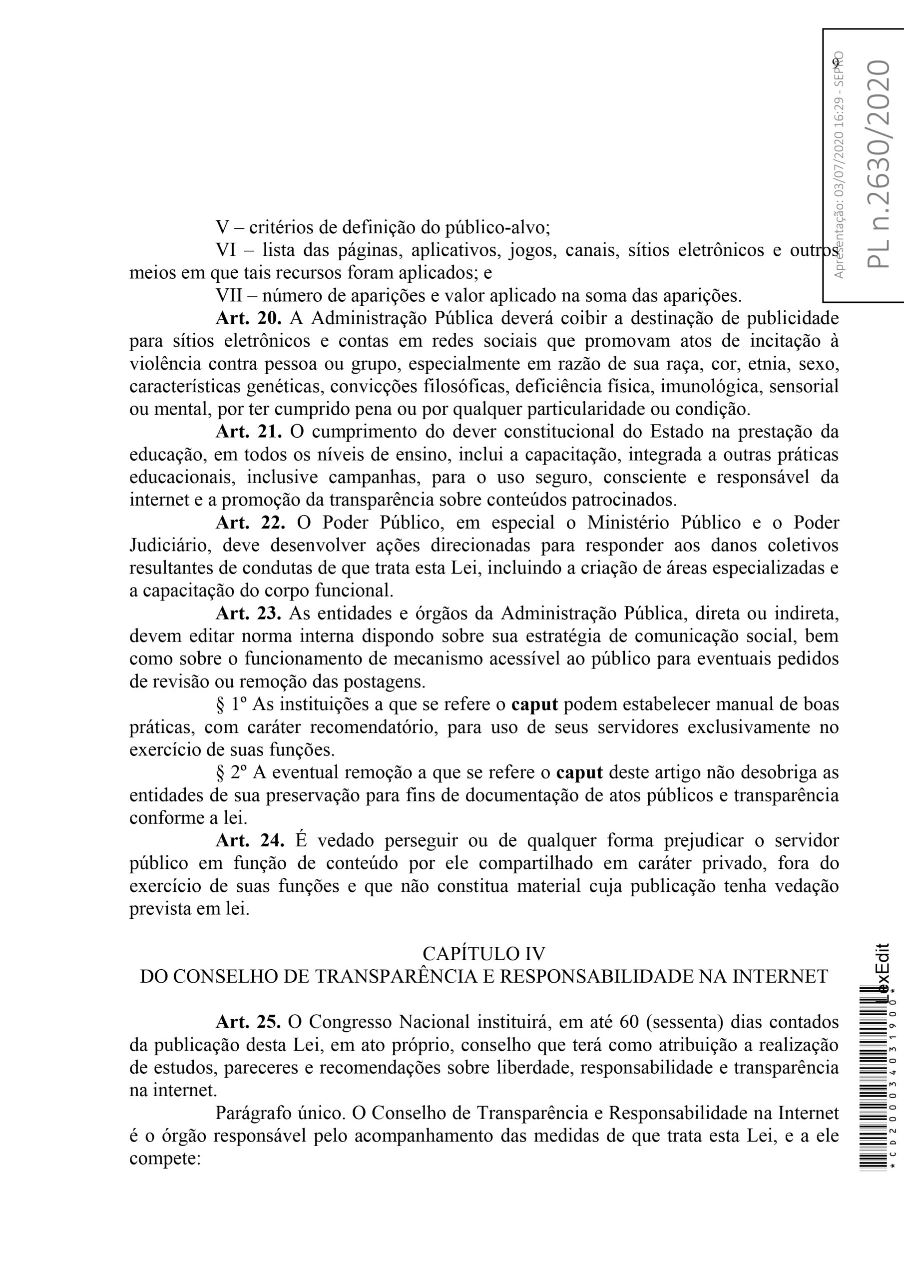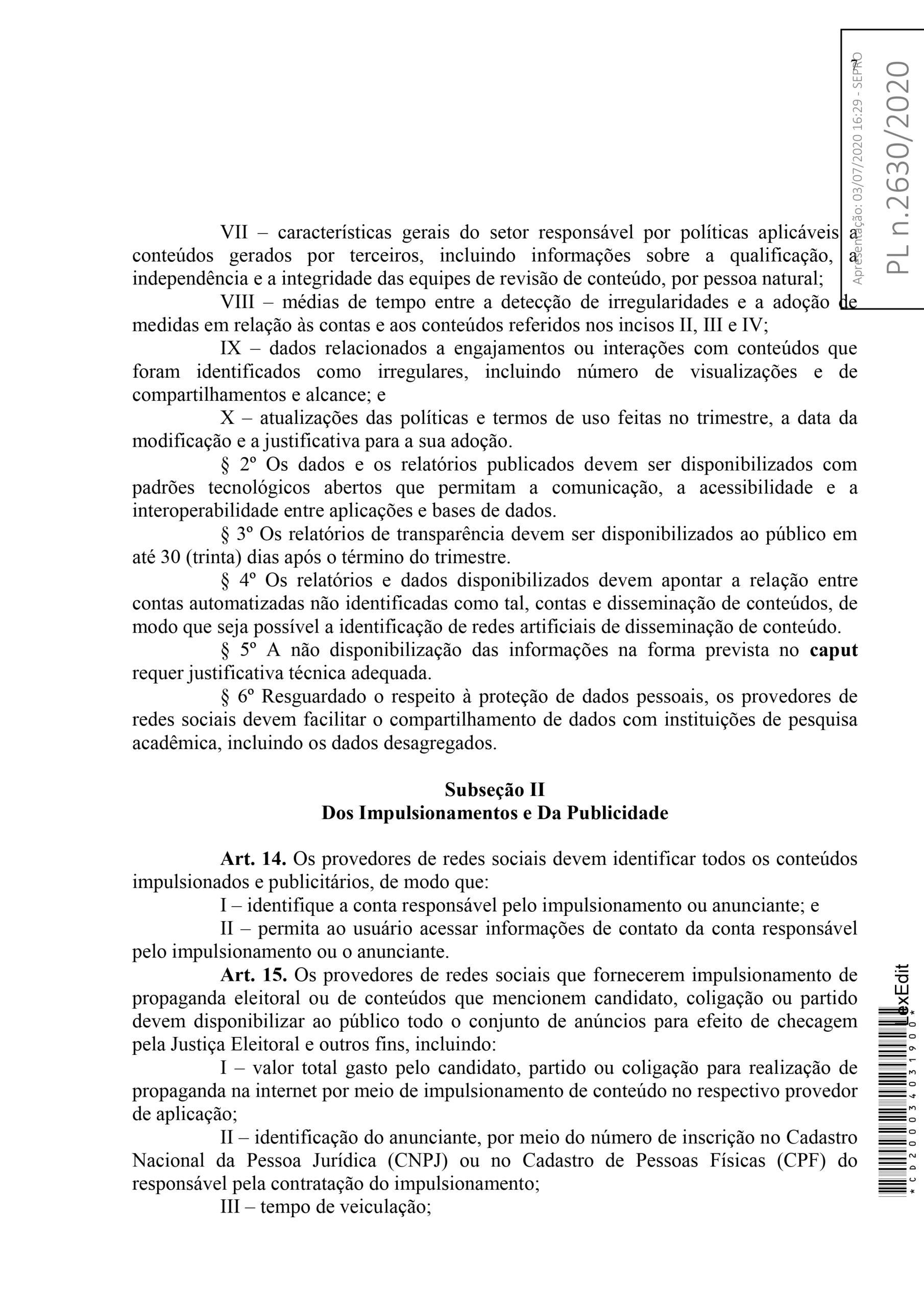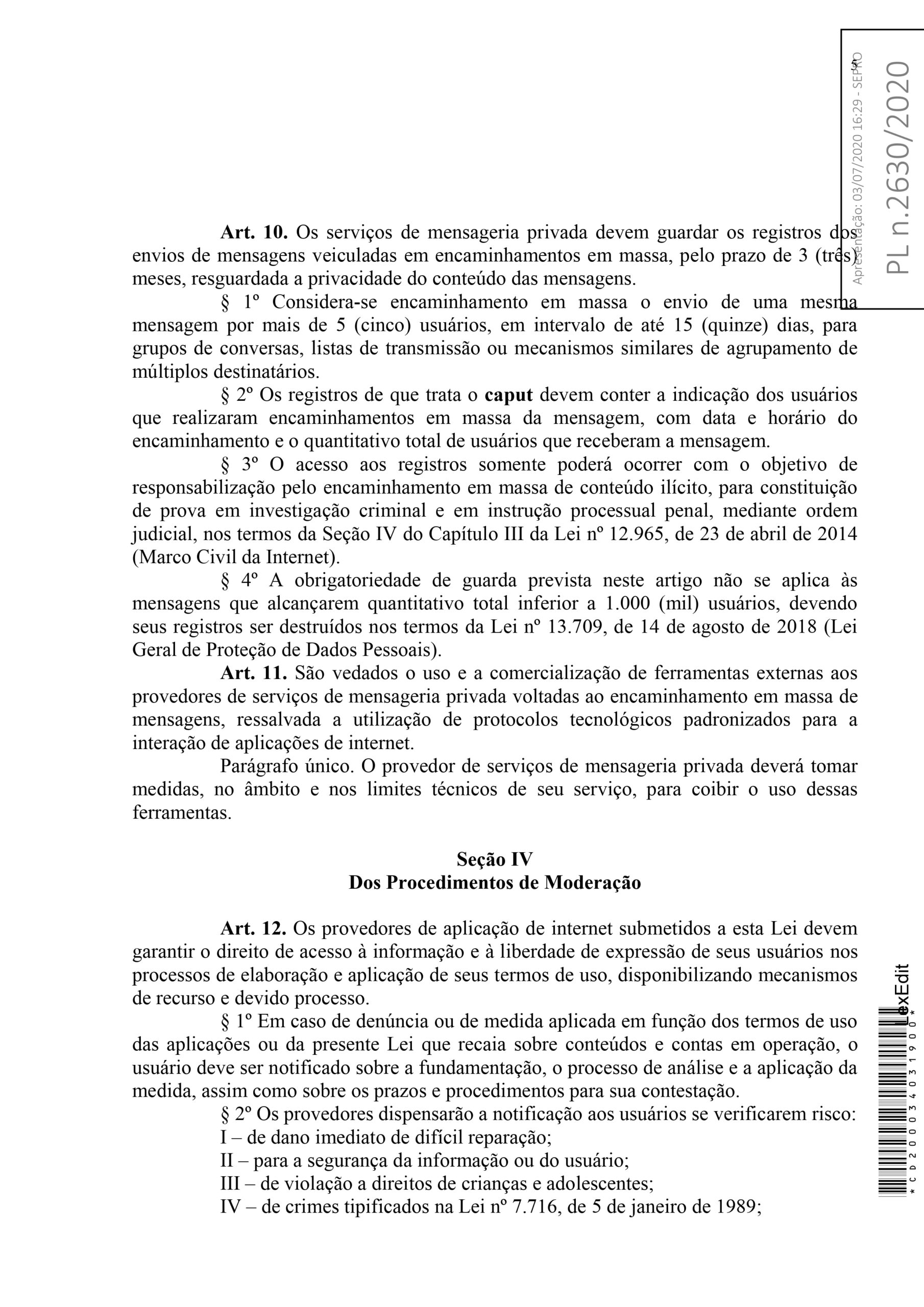 O Projeto de Lei 2630/20 institui a Lei Brasileira de Liberdade, Responsabilidade e Transparência na Internet. O texto cria medidas de combate à disseminação de conteúdo falso nas redes sociais, como Facebook e Twitter, e nos serviços de mensagens privadas, como WhatsApp e Telegram, excluindo-se serviços de uso corporativo e e-mail.