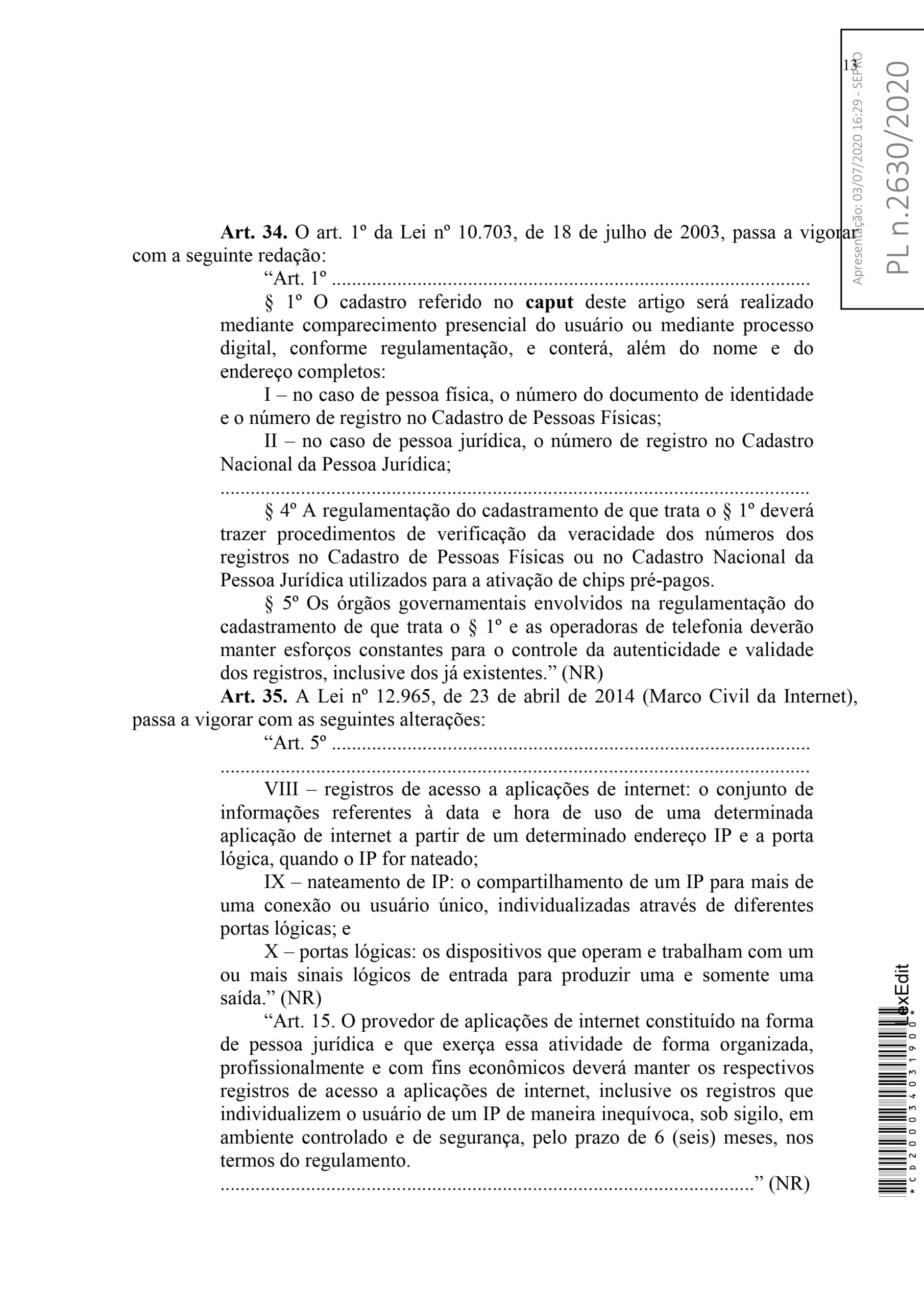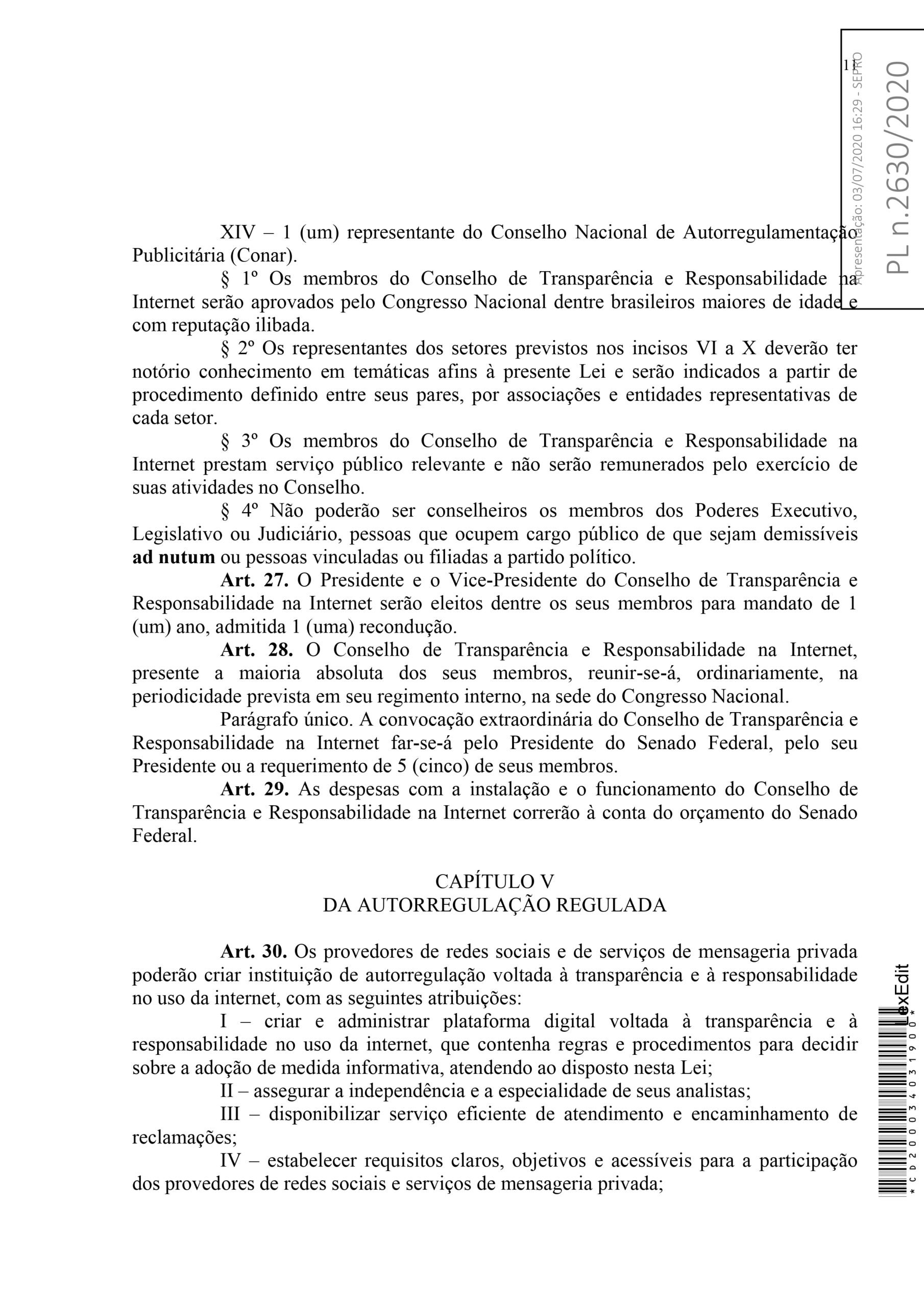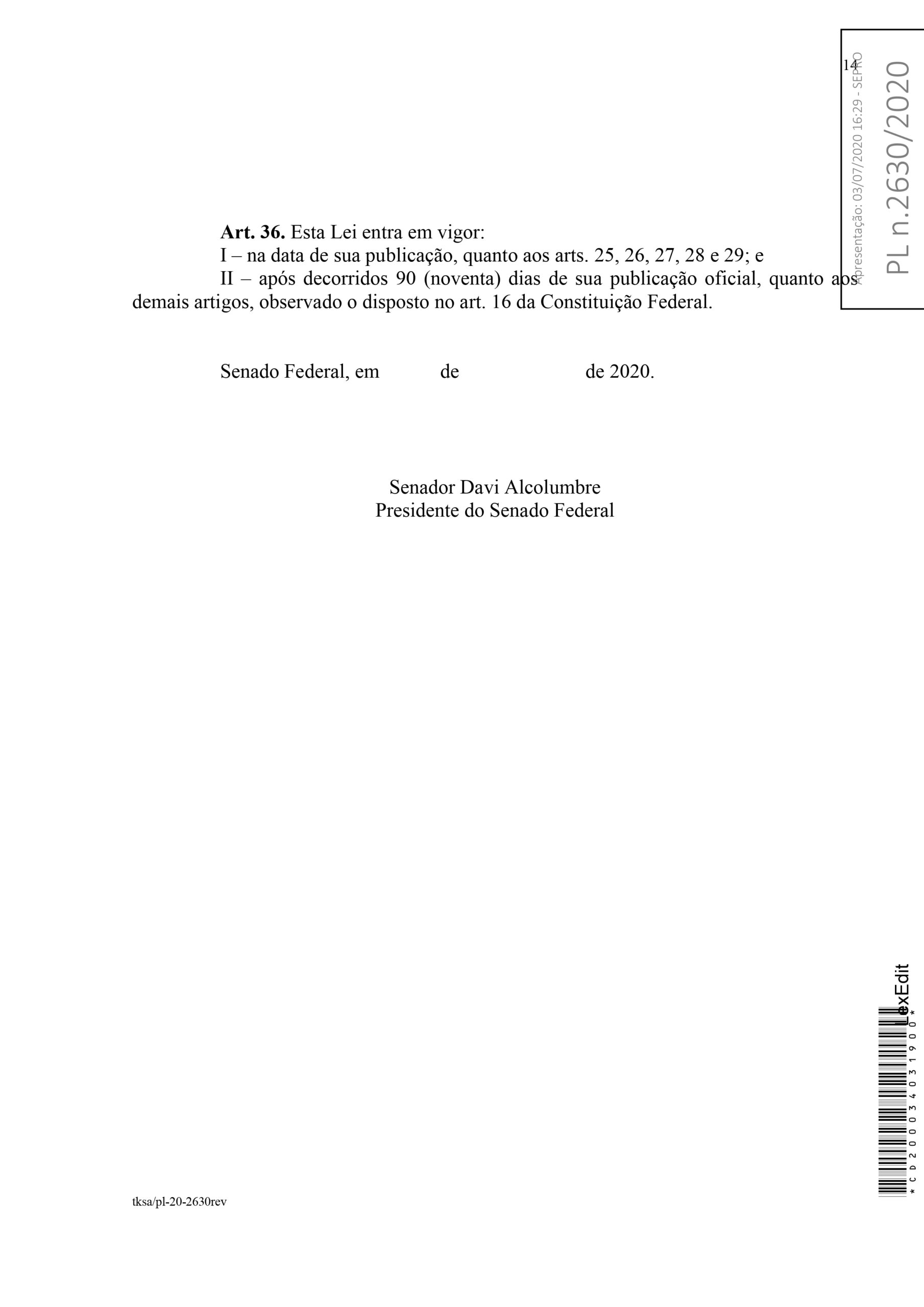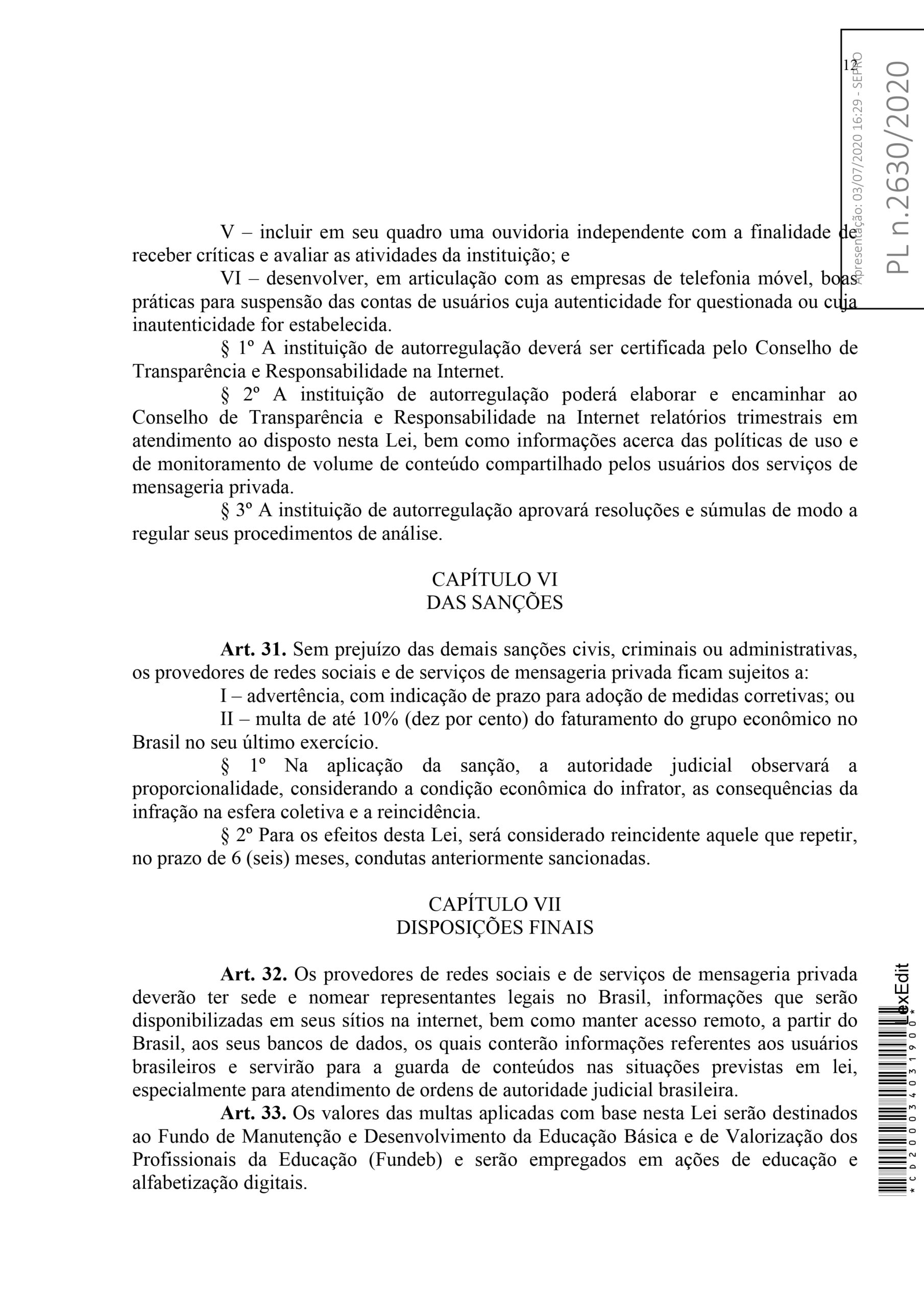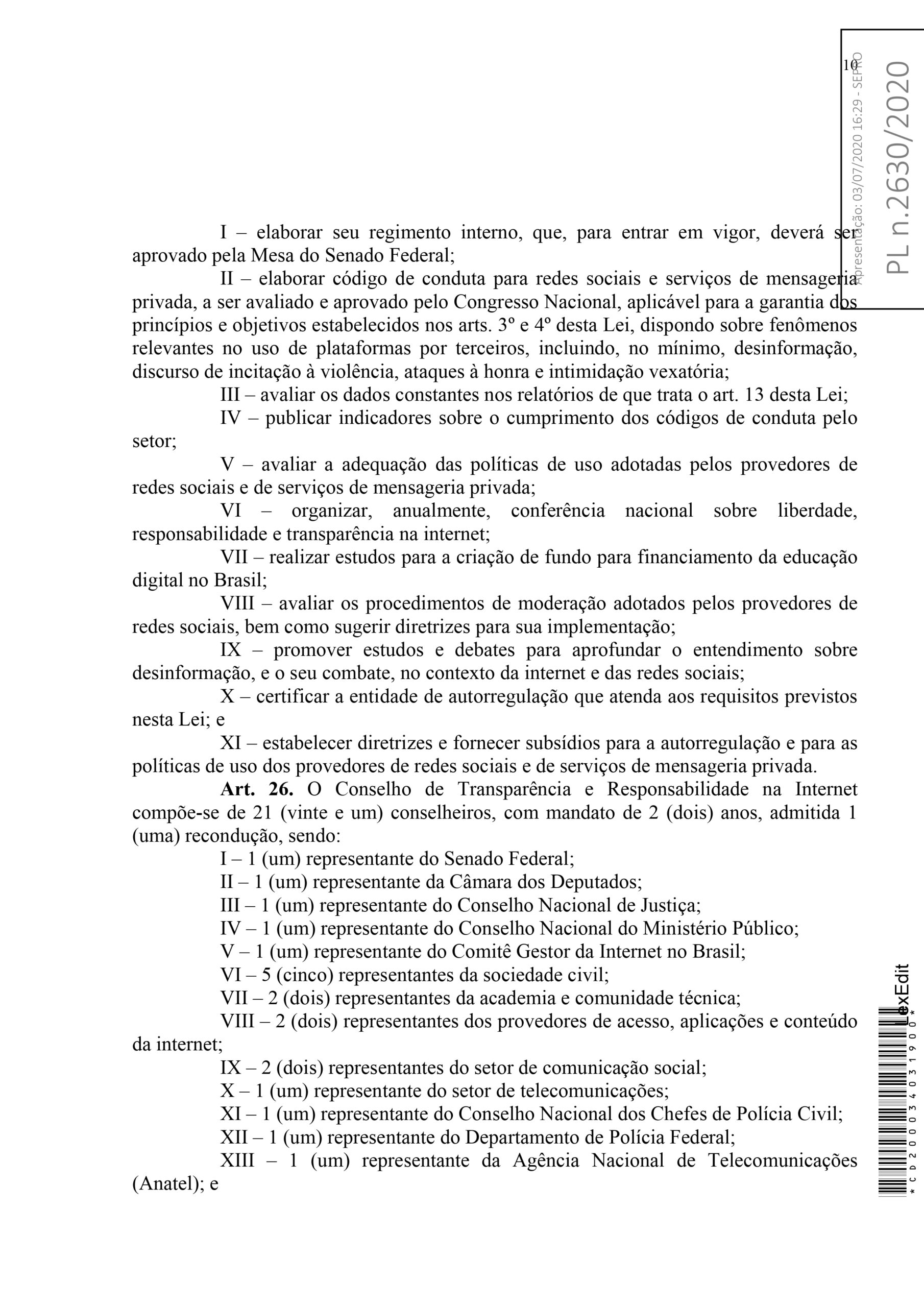 O Projeto de Lei 2630/20 institui a Lei Brasileira de Liberdade, Responsabilidade e Transparência na Internet. O texto cria medidas de combate à disseminação de conteúdo falso nas redes sociais, como Facebook e Twitter, e nos serviços de mensagens privadas, como WhatsApp e Telegram, excluindo-se serviços de uso corporativo e e-mail.
