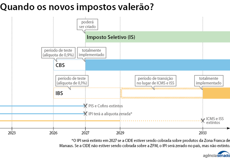 O substitutivo de Braga prevê redução da CBS e do Imposto Seletivo em 2030, se suas receitas medidas em 2027 e 2028 forem maiores que a média da arrecadação do PIS/Pasep, Cofins e IPI de 2012 a 2021. Em 2035, haverá outro momento de reavaliação, em que os tributos criados poderão ser reduzidos se a receita medida entre 2029 e 2033 for maior que a média da arrecadação dos impostos extintos, entre 2012 e 2021.