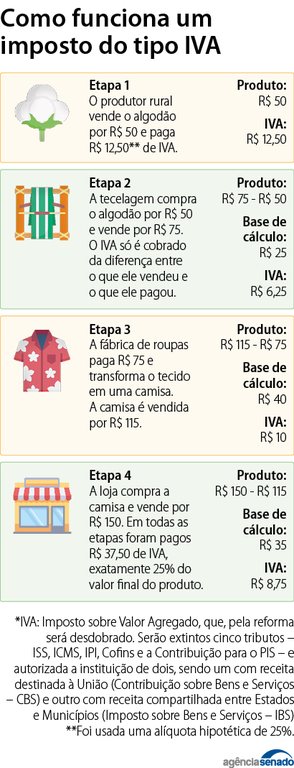 A reforma tem objetivo de simplificar o sistema tributário e transformará cinco tributos (ICMS, ISS, IPI, PIS e Cofins) em três: o Imposto sobre Bens e Serviços (IBS), Contribuição sobre Bens e Serviços (CBS) e Imposto Seletivo (IS). Cada novo tributo terá um período de transição. A CBS e o IBS, que tributam o consumo, são formas de Imposto sobre Valor Agregado (IVA), que incide apenas nas etapas do comércio que geram novo valor ao produto ou serviço e assim evita novas cobranças sobre impostos já pagos.