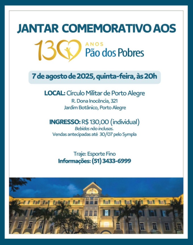 Jantar comemorativo aos 130 anos da Fundação O Pão dos Pobres de Santo Antônio. Dia 07 de agosto de 2025, às 20h. No Círculo Militar de Porto Alegre – Rua Dona Inocência, 321 – Jardim Botânico. Cardápio filé mignon e paella com inspiração mediterrânea, assinado pela chef Yara Grigera. Sobremesa petit gâteau, assinada pelos jovens do curso de gastronomia. Bebidas não inclusas. Investimento R$ 130 por pessoa (venda na sede) ou pelo Sympla. Traje sugerido esporte fino. Informações e ingressos pelo link https://www.sympla.com.br/evento/jantar-130-anos-pao-dos-pobres/3003971?share_id=2-copiarlink&referrer=linktr.ee ou pelo ou pelo WhatsApp 51 98971.9615. Doações espontâneas PIX CNPJ 92.666.015/0001-01. Site da fundação www.paodospobres.org.br. Instagram @fundacaopaodospobres